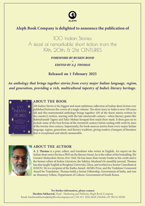 Announcement of Aleph Book Company about the launch of 100 Indian Stories on 1st Feb 2025